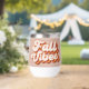 This retro-inspired fall design prominently features the phrase "Fall Vibes" in a bold, 3D-style font that immediately grabs attention. The text is layered with warm autumn colours, including rich oranges, deep reds, and soft creams, creating a sense of depth and dimension that makes the words pop off the background. The vintage-style typography with its soft, rounded edges gives the design a nostalgic feel, reminiscent of classic 1970s aesthetics. The playful shadows and colour contrasts add to the design's dynamic, eye-catching appeal.