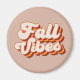 This retro-inspired fall design prominently features the phrase "Fall Vibes" in a bold, 3D-style font that immediately grabs attention. The text is layered with warm autumn colours, including rich oranges, deep reds, and soft creams, creating a sense of depth and dimension that makes the words pop off the background. The vintage-style typography with its soft, rounded edges gives the design a nostalgic feel, reminiscent of classic 1970s aesthetics. The playful shadows and colour contrasts add to the design's dynamic, eye-catching appeal.