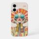 A phone case popping with retro fashion and glam, this design has a beautiful woman in a colorful striped orange and yellow wide brimmed hat with sophisticated sunglasses and her chin resting in her hands. Her stylish outfit has large polka dots in orange with yellow and aqua accents. Her lips are perfectly made up and she looks ready for the runway or a social time out on the town. A text template is included to personalize with your monogram initials. This is a fun case for ladies or girls who love fashion and beauty.