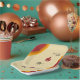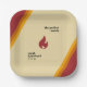 Red, orange and tan brown wedding paper plate with corner with stripe. Personalise it with your event details.