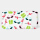 An iPhone 6 case featuring a pattern consisting of pink flamingos, green flip flops, and retro blue cat eye sunglasses.