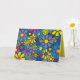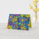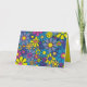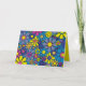 Retro Garden Gingham Flowers Maximalist Blue 60s 70s Floral Pattern Greeting Card. Cheerful, lively, vivid, bold, fun, colourful, whimsical vintage contemporary aesthetic design with a groovy 1960s 1970s flower power vibe. In striking blue, magenta pink, and yellow. Blank interior in cheerful matching yellow. By Kierkegaard Design Studio.