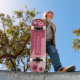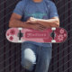 Cool retro 60s 70s vintage floral personalised skateboard design with simple magenta to pink monochromatic rainbow arch. With simple floral daisies and easy to use templates with custom cool groovy typography. Original artwork by artist Catherine Sweetman