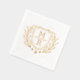 Retro floral design of foil stamped napkins with shield and monograms. Wedding napkin with two monograms, a shield and a wreath.