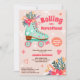 Introducing a fun and vibrant way to celebrate your upcoming arrival! Our "Rolling into Parenthood" baby shower invitation features a boho retro hand-illustrated design, centred around a whimsical teal roller skate adorned with flowers and hearts and pink laces. The playful editable pink background is accentuated with starbursts, hearts, floral elements and geometric pattern, dots and grid, capturing a lively and joyous mood. Perfect for those who love a mix of nostalgia and creativity, this invitation sets the tone for a memorable baby shower.