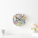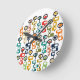 This clock has a mid-century modern design a retro flower garden in a retro colour palette or red, orange, yellow, green, and blue.