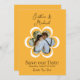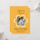 This custom Save the Date for the wedding announcement features a retro, 1970s inspired theme. The background is an orange colour, with brown text and the names of the couple printed in an elegant script font. A white, 70s style flower is printed in the centre. A sample photo is placed inside the flower frame which can be personalised to include your own custom photo or other image.