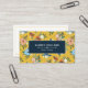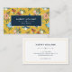 Pretty floral business card printed with an eye catching floral pattern in a strong mustard yellow with retro flowers in blush, coral, and blue with lots of blue and green leaves, and pale berries. Add your name and title to the dark blue label, and your contact info on the plain other side.