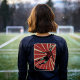 This stunning vintage-style poster beautifully encapsulates the fierce energy and unbridled passion of soccer. At its center, a dynamic footballer dons a striking red and black striped jersey, soaring through the air in an exhilarating leap to execute a dramatic header. The athlete's muscles are tense with determination, embodying the spirit of the game. Behind him, bold sunburst rays radiate outward, enveloping the scene in vibrant retro hues of deep crimson, classic black, and creamy tones, creating a breathtaking backdrop that amplifies the intensity of the moment.