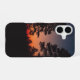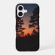 A striking retro forest scene with sharp silhouettes under a smooth gradient sky.
