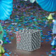 Retro Fox design items for the home, office, and personal use including dry erase boards, pillows, wallets, speakers, serving trays, buttons, cards, stickers, key chains, gift boxes and bags, candy favours, paper plates and magnets, bags, electronic device cases and sleeves, and so much more, all with a cute and colourful design of light blue rock orbs on dark blue, a light blue tree with red ball leaves, and an adorable red fox!