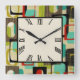 10.75” x 10.75” square acrylic wall clock with a fun retro image of black, brown, red and mustard frames, black and yellow patterned rectangles, and turquoise and white squares on tan. The cream square has a black border and Roman numeral clock face. See the entire Nifty 50s Clock collection in the DECOR | Clocks section.