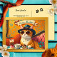 A cute whimsical retro postcard featuring a painting of a cat eating cakes.