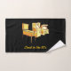 Retro gaming machines in yellow and orange colour pallete. Pinball and arcade machines. Custom text on all three towels. Seamless pattern on bath towel..