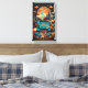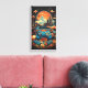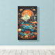 A vibrant canvas print blending futuristic cityscapes with retro gaming nostalgia. Featuring bold tones of blue, orange, and gold, this artwork highlights a classic game controller surrounded by consoles and flowers, symbolising the harmony between technology and creativity.
