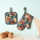 Retro Garden Groovy Nighttime Floral Pattern oven mitt and pot holder set for the kitchen by Kierkegaard Design Studio brings a vintage contemporary joyful yet elegant vibe to your space. The vibrant mix of blue and orange flowers against a dark black background can evoke a sense of nostalgia while adding a playful touch. A pretty, modern take on the 60s and 70s. Makes a great gift for the cook.
