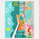 This Retro Gay Pool Party Fleece Blanket features four hunky beefcakes having a gay old time as they beat the Palm Springs heat by lounging around the turquoise blue water of their atomic boomerang shaped swimming pool. The mid century modern architecture on the fabulous, orange stone house is clearly prime real estate, given the view of the mountains in the background. A yellow starburst sun shines brightly in the turquoise sky so you are able to see every charming detail--from the kitschy, pink flamingos to the 1950’s striped, breezy blocks fence. And of course what Palm Springs House would be complete without a palm tree?