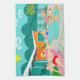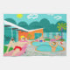 This Retro Gay Pool Party Kitchen Towel design features four hunky beefcakes having a gay old time as they beat the Palm Springs heat by lounging around the turquoise blue water of their atomic boomerang shaped swimming pool. The mid century modern architecture on the fabulous, orange stone house is clearly prime real estate, given the view of the mountains in the background. A yellow starburst sun shines brightly in the turquoise sky so you are able to see every charming detail--from the kitschy, pink flamingos to the 1950’s striped, breezy blocks fence. And of course what Palm Springs House would be complete without a palm tree?