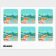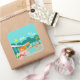 This Retro Gay Pool Party Sticker design features four hunky beefcakes having a gay old time as they beat the Palm Springs heat by lounging around the turquoise blue water of their atomic boomerang shaped swimming pool. The mid century modern architecture on the fabulous, orange stone house is clearly prime real estate, given the view of the mountains in the background. A yellow starburst sun shines brightly in the turquoise sky so you are able to see every charming detail--from the kitschy, pink flamingos to the 1950’s striped, breezy blocks fence. And of course what Palm Springs House would be complete without a palm tree?