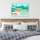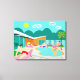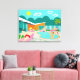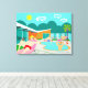 This Retro Gay Pool Party Wrapped Canvas features four hunky beefcakes having a gay old time as they beat the Palm Springs heat by lounging around the turquoise blue water of their atomic boomerang shaped swimming pool. The mid century modern architecture on the fabulous, orange stone house is clearly prime real estate, given the view of the mountains in the background. A yellow starburst sun shines brightly in the turquoise sky so you are able to see every charming detail--from the kitschy, pink flamingos to the 1950’s striped, breezy blocks fence. And of course what Palm Springs House would be complete without a palm tree?