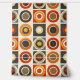 This artwork features a vibrant and bold pattern of concentric circles and squares arranged in a structured grid format. The design showcases a retro-inspired colour palette of warm oranges, deep browns, yellows, and creams, creating a nostalgic yet modern feel. Each circle is perfectly centred within its square, with the repeating patterns creating a rhythmic and balanced composition. The use of strong, contrasting colours and geometric shapes gives the piece a dynamic and visually engaging appearance, reminiscent of mid-century modern design.