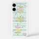 A mid-century modern style phone case featuring geometric diamond shapes arranged on a teal stripe background in popular atomic era colours. Designed for iPhones.