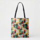 This tote features a vibrant retro geometric pattern, showcasing a mix of rectangles, circles, and lines in red, yellow, green, and blue tones against a neutral background. Perfect for those who love abstract designs and vintage-inspired styles, this bag adds a pop of colour and artistic flair to any outfit.