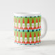 Any way you look at it this Retro Geometric Santa Jumbo Mug is pure holiday whimsy! It’s rows of Santas. No, it’s rows of Christmas trees. No, it’s rows of Santas shaped like Christmas trees and rows of cheery green Christmas trees with white polka dots. It’s kitschy. It’s colourful. And it if doesn’t put you in the holiday spirit, something is definitely wrong with you! Each identical triangular Santa Claus is wearing his trademark red and white suit and hat. Each hat has a yellow starburst on top, which serves as a tassel for Santa’s headwear and a vintage star for a Christmas tree. Old Saint Nick has a well-groomed white beard, jolly red nose and cheerful curved eyes. Each Santa’s black boots also serve as a trunk to a Christmas tree. Where Santa’s feet and tree trunks meet, there is a stripe of mid century inspired aqua. A purchase of this product is guaranteed to keep you off the naughty list no matter what you’ve done!