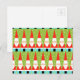 Any way you look at it this Retro Geometric Santa Postcard is pure holiday whimsy! It’s rows of Santas. No, it’s rows of Christmas trees. No, it’s rows of Santas shaped like Christmas trees and rows of cheery green Christmas trees with white polka dots. It’s kitschy. It’s colourful. And it if doesn’t put you in the holiday spirit, something is definitely wrong with you! Each identical triangular Santa Claus is wearing his trademark red and white suit and hat. Each hat has a yellow starburst on top, which serves as a tassel for Santa’s headwear and a vintage star for a Christmas tree. Old Saint Nick has a well-groomed white beard, jolly red nose and cheerful curved eyes. Each Santa’s black boots also serve as a trunk to a Christmas tree. Where Santa’s feet and tree trunks meet, there is a stripe of mid century inspired aqua. A purchase of this product is guaranteed to keep you off the naughty list no matter what you’ve done!