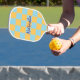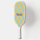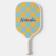 You'll be courting success with this bright and colourful pickleball paddle. Elevate your game and enjoy the boost of bright sunshine yellow and sky blue, which form a checked pattern of squares for a fresh retro effect. The reverse side of the paddle is plain yellow. Personalise this cute and fun design with a name, which will appear in script typography across the pattern. An ideal custom gift for pickleball players.