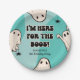 Cute halloween birthday party paper plates featuring a groovy blue background, a group of retro ghosts, creepy spiders, the fun saying “i'm here for the boos!”, and a modern text template that is easy to personalise.