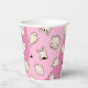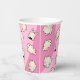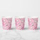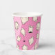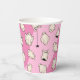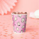 Cute halloween party paper cups featuring a groovy pink background, a group of retro ghosts, and creepy spiders.