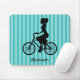 A cute retro graphic illustration. A silhouette of a woman in a ponytail, wearing a dress and riding a bicycle. The background is a turquoise blue striped pattern with alternating light and dark tones.