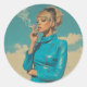 Stylish retro-inspired artwork of a glamourous woman in a striking blue leather jacket, confidently smoking under a clear sky. With bold eyeliner, chic blonde hair, and oversized sunglasses, this vintage-style illustration captures timeless elegance and rebellious charm. Perfect for lovers of retro fashion, edgy aesthetics, and pop art vibes.