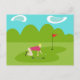 This Retro Golfer Postcard is more fun than a day on the greens. The 1960's style, minimalist art design is anything but par for the course. It features a lone golfer on a lush, green fairway. The mid century modern golfer is making a real fashion statement in his stylish, plaid, golf pants and fuchsia shirt. The blonde, fit, weekend warrior is on his hands and knees attempting to line up a shot. Or maybe he's attempting to give the ball a nudge in the direction of the hole. Does it really matter? At his side, we see a single, golf club. In front of him, is the elusive hole, with a red flag, which is taunting him. The background features a green line of cartoon trees, an aqua sky and two, white, kidney bean shaped clouds. This design is sure to be a hole in one with your favourite golf pro.