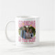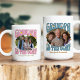 Retro goat mug for grandma with custom photo. Your photo will be displayed in a wavy edge sticker shape and framed with "grandma is the goat". lettered in retro typography and decorated with love hearts. Personalise with the name(s) of the grandchild or grandkids or any text you like. Use the same photo front and back or, a different photo for each side. Feel free to customise the colour palette in the design tool. Cool and useful gift for a grandma who's the 'Greatest Of All Time' for holiday, birthday, mother's day or just because!