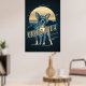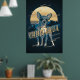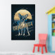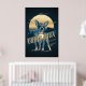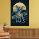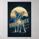 Striking retro-style poster design of a Chihuahua with a background of mountains and large sun graphic all in a striking color palette of gold through prussian blue. A large decorative font names the dog breed. Search ID754 to see other color options and additional dog breeds in this style.