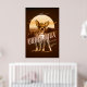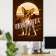 Striking retro-style poster design of a Chihuahua with a background of mountains and large sun graphic all in monochrome shades of gold through brown. A large decorative font names the dog breed. Search ID754 to see other color options and additional dog breeds in this style.