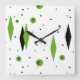 This customisable Retro Green Diamonds and Starbursts Square Wall Clock is a new take on a vintage style. It features kitschy, black starbursts on green polka dots, surrounding geometric, green and black diamond shapes. Customise the background colour on this mid century modern product if you're feeling daring, or leave it white if subdued is more your style. You're sure to enjoy our homage to the 1950s. Buy this today and be the coolest cat on your block.