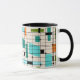 This Retro Grid and Starbursts Ringer Mug is where vintage style meets modern day. It features a cream coloured background with kitschy, off kilter squares and rectangles in teal, turquoise, This light blue, orange, and avocado green. The whimsical blocks of colour are overlayed are worked into some of the grid intersections. There are also black rectangles with black vertical and horizontal lines forming a grid pattern. Black starburst designs and squares placed sporadically throughout this mid century modern tapestry of colour. Grab your go-go boots and bell-bottoms and enjoy this throwback to the 1960s.