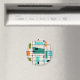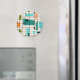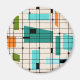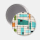 This Retro Grid and Starbursts Round Magnet is where vintage style meets modern day. It features a cream coloured background with kitschy, off kilter squares and rectangles in teal, turquoise, This light blue, orange, and avocado green. The whimsical blocks of colour are overlayed are worked into some of the grid intersections. There are also black rectangles with black vertical and horizontal lines forming a grid pattern. Black starburst designs and squares placed sporadically throughout this mid century modern tapestry of colour. Grab your go-go boots and bell-bottoms and enjoy this throwback to the 1960s.
