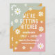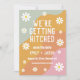 This wedding invitation card a retro colour palette. Select "personalise this template" to edit most wording. If further edits need to be made such as the background colour, text colours, and more please select "customise further" from the toolbar.