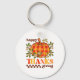 Retro groovy style colourful Thanksgiving keychain. Elegant retro font typography "Happy Thanksgiving", with cute daisy flowers, stars and a chequered pumpkin.