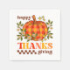 Retro groovy style colourful Thanksgiving napkins. Elegant retro font typography "Happy Thanksgiving", with cute daisy flowers, stars and a chequered pumpkin.