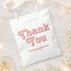 This bold coral pink “thank you” wedding favour bag design embraces a groovy 70s theme, with pink retro typography. Perfect for couples who love vintage charm with a modern twist, and ideal for retro-inspired, boho, or summer weddings. Explore matching items in our wedding suite to complete the look!