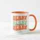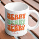 Retro groovy typography customisable script coffee mug. The design features the text "Merry Christmas" in orange and green retro groovy typography with boho-themed floral elements. The name can be easily customised. Makes for the best personalised gift for yourself, your friends, family members and even neighbours. We have 45+ more Christmas mugs in retro design, watercolor and funny typography-based in our collection that you will definitely love. Merry Christmas!