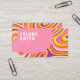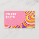 A Vintage retro Psychedelic colourful liquid business card. That features a handmade groovy pattern boho abstract wavy shapes lines .In elegant chic purple and pink and yellow and orange . Modern yet it has nostalgic seventies vibes and colours and groovy fonts. With customisable name and profession and QR code.