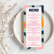 1970s vintage retro groovy personalised wedding menu card in groovy bold typography and pastel colours including; pink, blue and orange. This menu card is easily editable. If you need help with the customisation of this product or you need more matching products for this collection kindly message me via Zazzle.