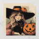 Send a little vintage magic through the mail this spooky season with this delightful 5.25" x 5.25" square greeting card, featuring a retro illustration that brings together all the best elements of Halloween charm. At the centre of the design is a pretty witch, poised and relaxed, wearing a tall, classic pointy witch hat that adds just the right amount of enchantment to the scene. Beside her sits a sleek black cat, her loyal companion, and a glowing jack-o’-lantern that adds warmth and festive spirit to the composition. Rendered in a nostalgic colour palette and drawing inspiration from 1960s and 1970s illustration styles, this artwork captures the heart of vintage Halloween with a playful yet elegant touch.