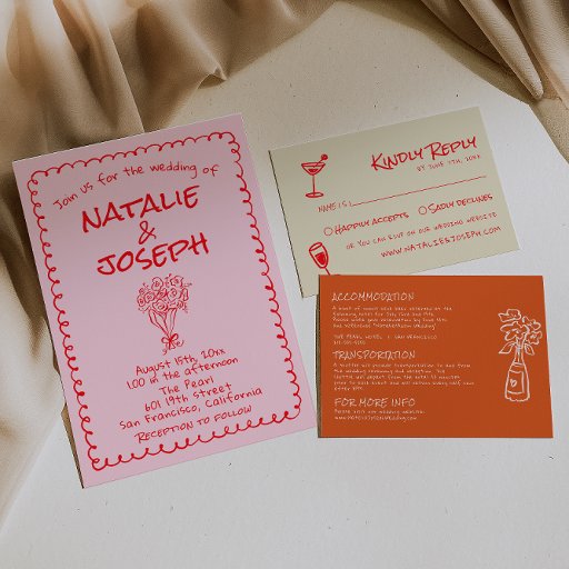 This wedding invitation is perfect for your wedding if you are looking for an elegant unique and easy editable invitation .An elegant unique minimalist quirky wedding template invitation. Which features plain blush pink background and handwritten front. And hand written bride's and groom's first names in vivid read. and editable info with hand drawn flower bouquet in the centre. And customisable photo on the back inside a hand drawn red wavy frame and customisable QR Code so your invites could RSVP online easily and access your wedding details. Affordable and it is also digital electronic e-invitation if you want to send it by text or email. All the info are customisable by clicking on the personalise button. So Grab it and make it yours so you make you invites engaged and excited .